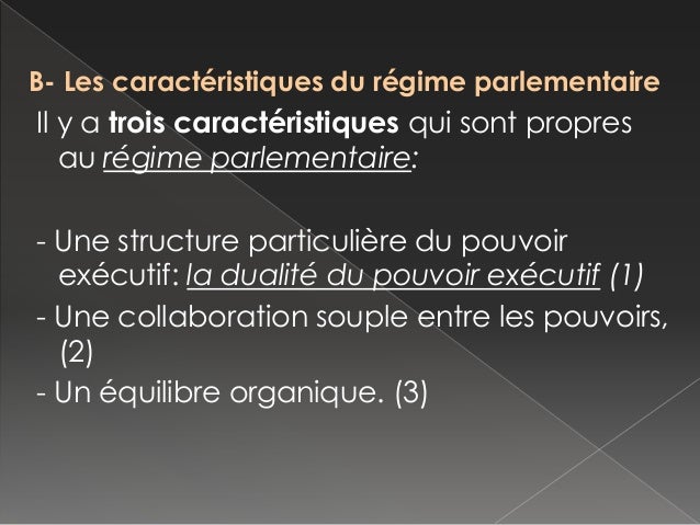 Le régime parlementaire est caractérisé par la collaboration du pouvoir législatif et du pouvoir exécutif. De plus, le Gouvernement est indépendant mais il reste responsable politiquement devant le Parlement, bien que celui-ci puisse mettre en jeu la responsabilité politique du gouvernement,...
